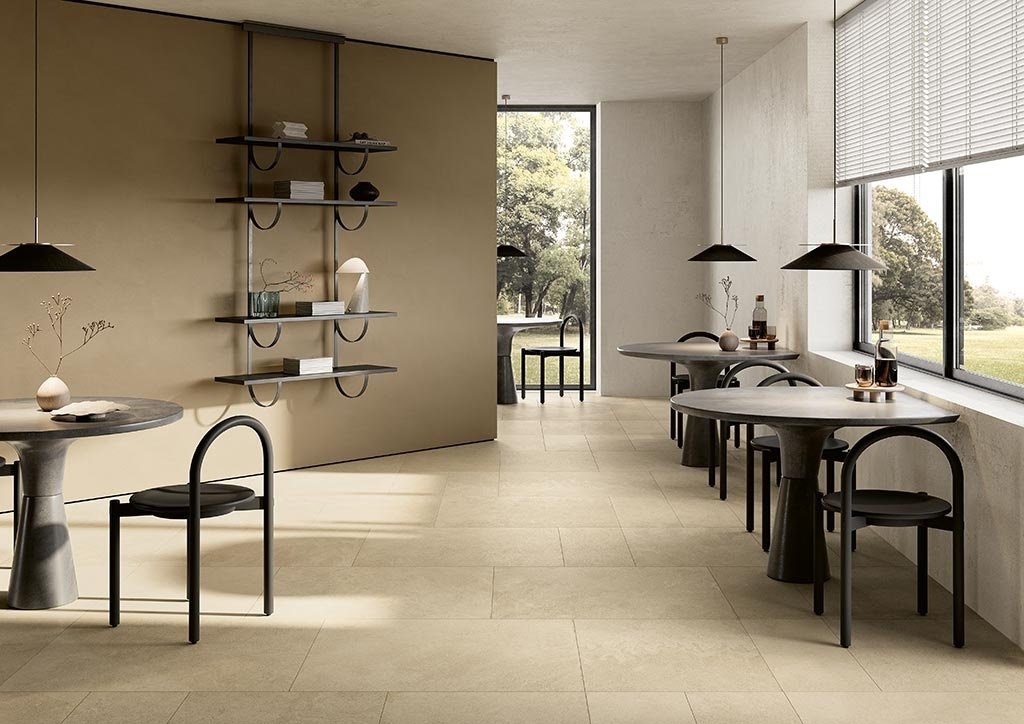 Slip-resistant honed limestone tiles with natural thermal mass—cool in summer, radiant in winter. Acid-resistant finish withstands vineyard use.